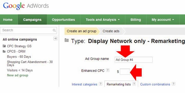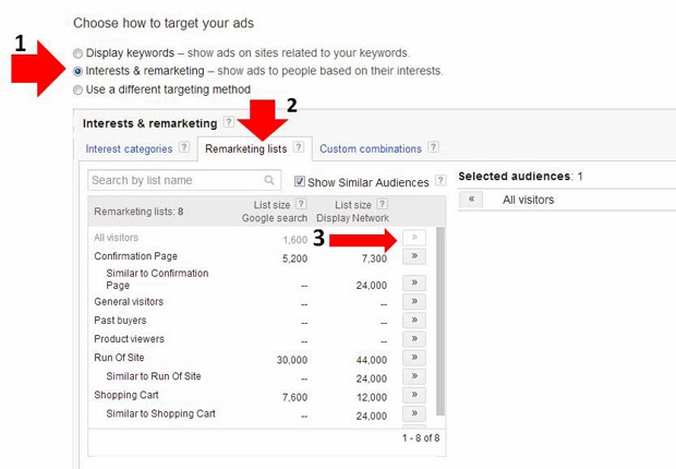 To select the remarketing list you need to navigate to “Interests & remarketing” > “Remarketing lists,” Now use the provided arrows to add different user groups to selected audiences.